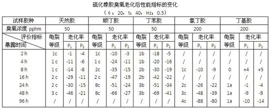 試驗結(jié)果是根據(jù)評價指標(biāo)所觀測的數(shù)據(jù)來表示的。硫化橡膠臭氧老化的評價指標(biāo)有多種,常用而簡便的多采用直接觀測法。主要是通過顯微鏡、放大鏡或肉眼直接觀測發(fā)生在試樣表面的臭氧龜裂,例如記錄裂紋首先出現(xiàn)的時間,或裂紋剛斷裂的時間。又如觀測試樣龜裂的特征和狀況,記錄龜裂的寬度和密度,從而評定試樣龜裂程度和等級。評價龜裂的等級,可以參照GB11206《硫化橡膠老化表面龜裂試驗方法》第10.3條的規(guī)定進(jìn)行。該標(biāo)準(zhǔn)將試樣表面的龜裂寬度分為1至4級,龜裂密度分為a、b和c級,兩者組合起來就表示其龜裂等級。試驗結(jié)果也可用硫化橡膠的實用性能,如測試試樣老化前后的拉伸性能變化率來表示。由于硫化橡膠受臭氧老化后,結(jié)構(gòu)遭到破壞,分子鏈斷裂,表面形成裂紋,導(dǎo)致其拉伸性能發(fā)生變化。隨著老化的深入發(fā)展,表面龜裂也在增長深化,使其拉伸性能如拉伸強(qiáng)度、扯斷伸長率等逐漸變差變劣,從而間接也評價出該硫化橡膠耐臭氧老化性能的好壞。下表是幾種硫化橡膠試樣在臭氧老化試驗箱內(nèi)經(jīng)不同的時間暴露后生成的臭氧龜裂等級與拉伸強(qiáng)度和扯斷伸長率(老化率)相應(yīng)變化的試驗結(jié)果。從表中可看出,試樣的龜裂變化與拉伸性能的變化有一定的相互關(guān)系,在各自的范圍內(nèi)都可以反映出試樣的耐臭氧老化性能,故它們都可以作為評價的指標(biāo)。因此,臭氧老化試驗箱GB/T13642-1992標(biāo)準(zhǔn)除了采用試樣出裂時間和龜裂等級表示試驗結(jié)果外,補(bǔ)充了可以采用試樣斷裂時間和老化性能變化率(老化率)來表示試驗結(jié)果。